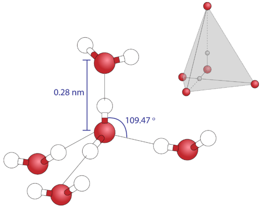 ? ? ? ? 正是氫鍵的存在使水分子和同簇分子相比具有特異性。如水的密度變化,一般物質具有熱脹冷縮的性質,即溫度降低,體積變小,密度增大。水卻在4°C時密度最大,其值為1g/cm3。固體冰中,相鄰水分子以氫鍵結合,形成正四面體的空間網狀結構。由于氫鍵具有方向性,導致水分子之間的孔隙變大,密度減小,水的固態密度低于液態密度的特性對于地球生命來說有著極其重要的意義(0°C時,冰的密度為0.9168g/cm3)。