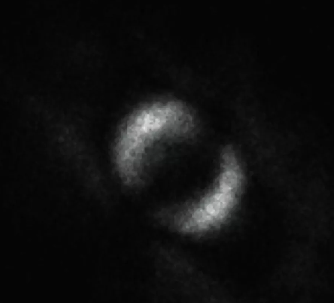 下面這張看起來神似太極圖的黑白圖像,并非像有些讀者直觀理解的那樣是兩路處于糾纏態的光子,而是其中一路光子的分布圖像。在另一路糾纏光子的遠程影響下,圖像呈現為一分為二的指環狀,表明兩路光子的狀態改變是一致的。