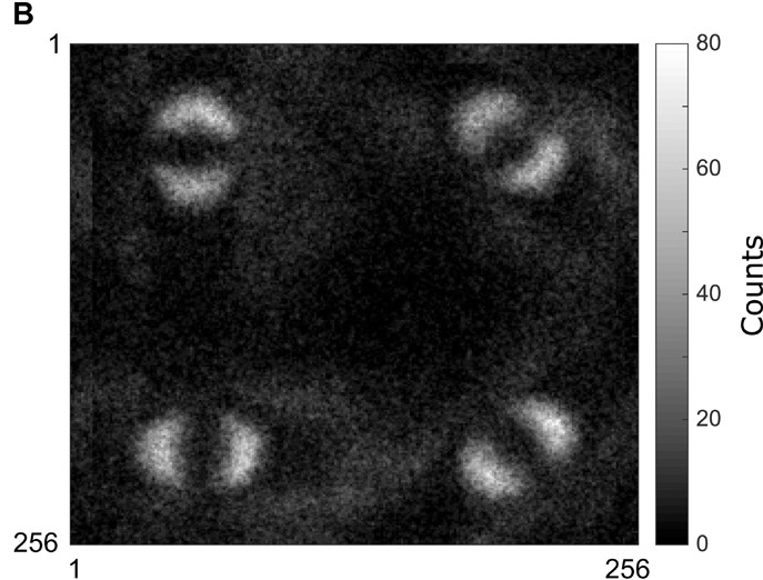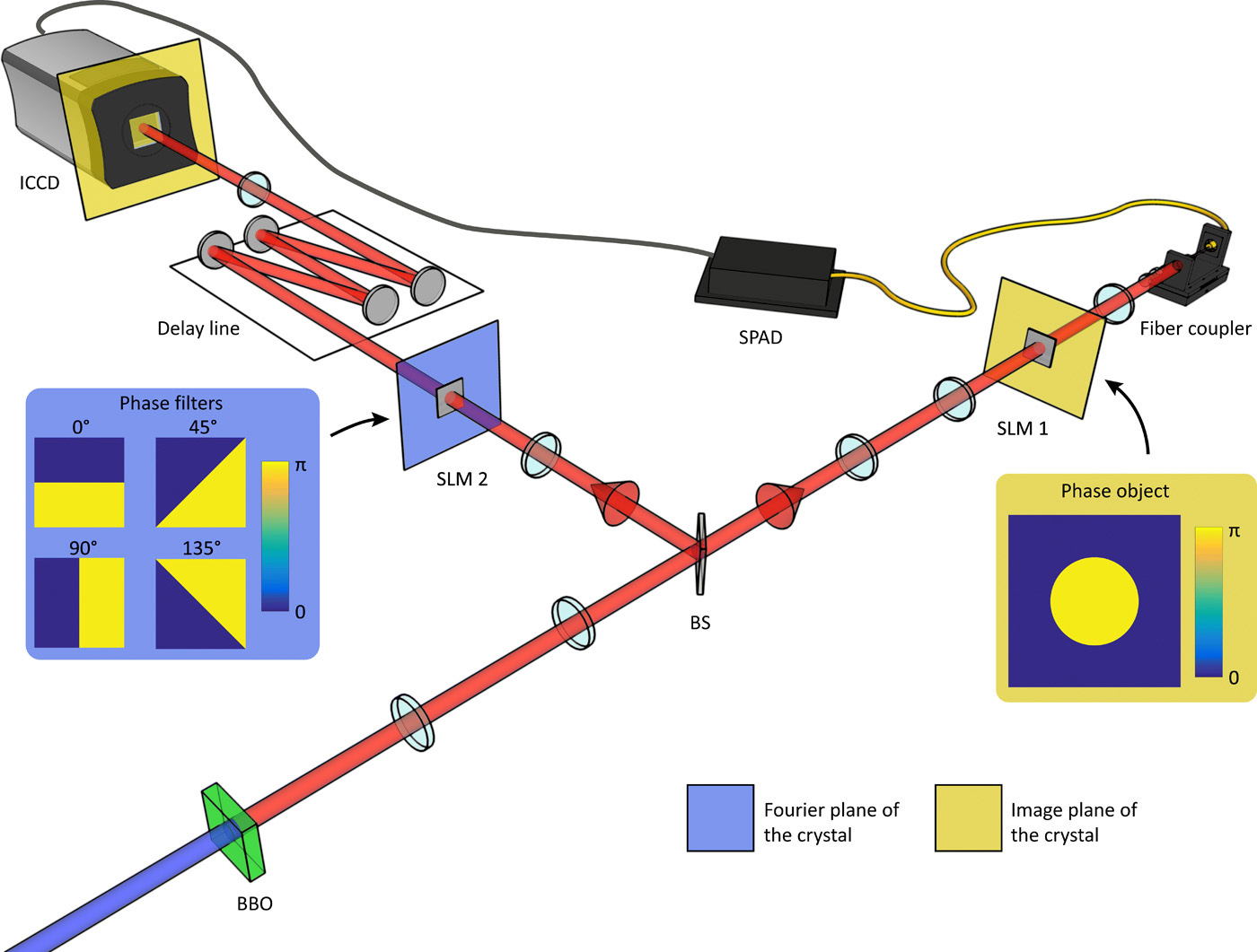 其中,光子A穿過空間光調制器1改變相位信息,經單模光纖收集后被單光子探測器探測到,觸發另一路上的照相機。光子B則通過空間光調制器2后,進入一條延長線等待被拍攝。